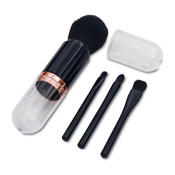 Zestaw składa się z wysuwanego pędzla do nakładania pudru oraz 3 pędzelków do makijażu oczu w praktycznym etui.